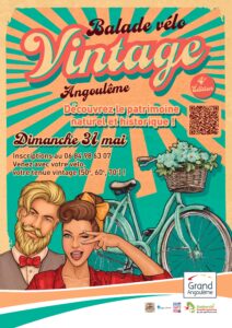 Cette année GrandAngoulême s’associe à l’évènement « Angoulême Vintage Days », et vous invite à participer à la 4ème édition de sa Balade Vélo Vintage. Partez à la découverte du patrimoine naturel et historique d’Angoulême dans une ambiance rétro le dimanche 31 mai de 9h30 à 12h. Cette balade est ouverte exclusivement aux personnes habillées en tenue (50's, 60's, 70's) et utilisant un vélo ancien*.
