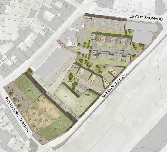 - La partie sud de l'îlot, correspondant à la seconde tranche d'aménagement du secteur, est en cours de définition ; elle devrait accueillir un commerce alimentaire, des petits commerces et un équipement de proximité, aménagés autour d'un espace de rencontre, à l'angle des rues Didelon et de Paris. Livraison prévue le 2ème semestre 2020.